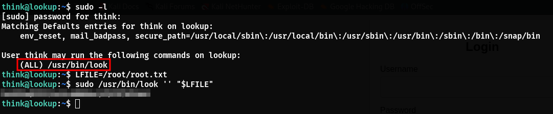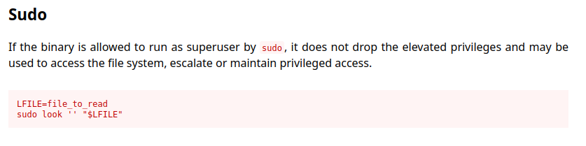 sudo -l we found that we have access to “look” with sudo. - After search in GTFO bins Click Here we found a bypass.